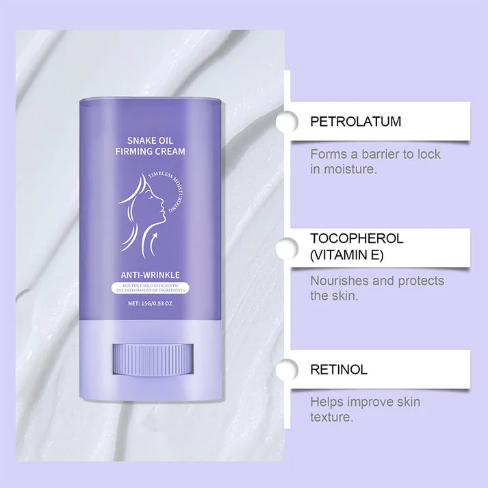 Key Ingredients: Mineral Oil, Petrolatum, Cera Alba (Beeswax), Tocopherol (Vitamin E), Retinol, Snake Oil